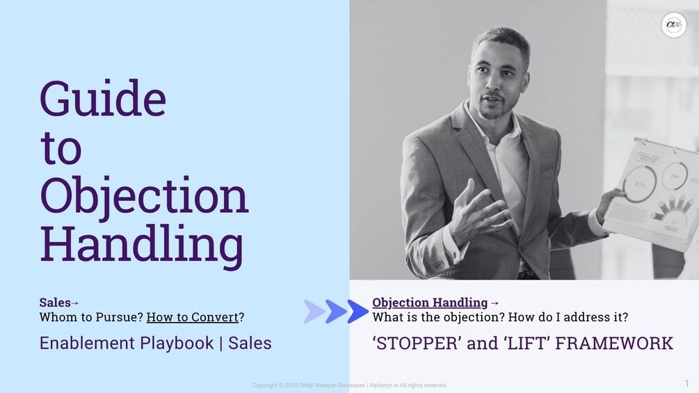 Stop guessing how to handle objections and start diagnosing the root cause. This toolkit provides the proprietary STOPPER framework to identify the real obstacle (Trust, Risk, Price, Priority etc.) and the LIFT process to navigate to a committed next step, instantly boosting deal velocity.